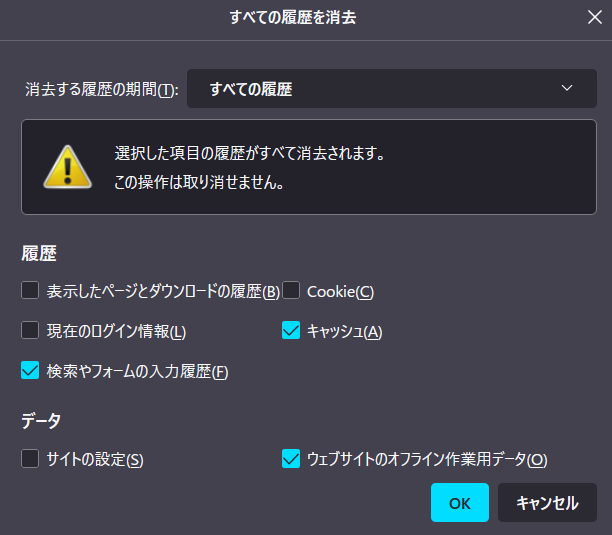 ※ちなみにログイン情報を吹っ飛ばしたくない方は「Cookie」「現在のログイン情報」からチェックを外すことをおすすめしときます